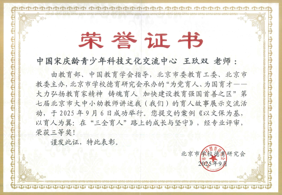 文保工作专班宋庆龄儿童科学技术馆王玖双老师以《以文保为基,以育人为翼:在“三全育人”路上的成长与坚守》荣获专业三等奖。